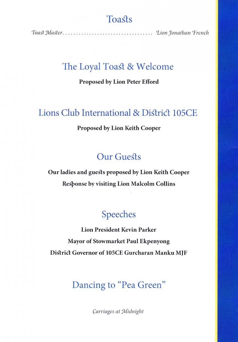 On 5th October, members of the Lions Club of Stowmarket and District gathered with their guests and friends to celebrate the Club’s 39 Charter Anniversary.  The president’s guests on were the District Governor of 105CE, Lion Gurcharan Manku and the Mayor of Stowmarket, Paul Ekpenyong.  Visiting Lion and responding to the toast on behalf of the guests was Lion Malcolm Collins of Filey Lions Club.